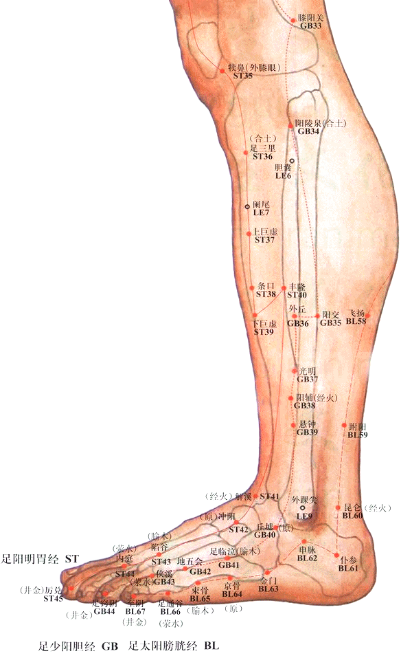 刺法:直刺或斜刺0.3~0.5寸,局部有酸胀感,或扩散至足背。